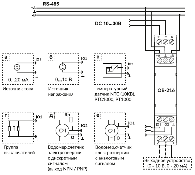 OB-216 может быть использован как: − удаленный измеритель постоянного напряжения (0 – 10 В); − удаленный измеритель постоянного тока (0 – 20 мА); − удаленный измеритель температуры с возможностью подключения датчиков NTC (10KB), PTC 1000, PT 1000 или цифрового датчика температуры D18B20, DHT21, DHT22, AM2301; − счетчик импульсов с сохранением результата в памяти; − отслеживание состояния (замкнуто / разомкнуто) контакта на входе типа «сухой контакт». OB-216 обеспечивает : − управление нагрузкой по выходному аналоговому сигналу (0 – 10 В, 0 – 20 мА), в зависимости от получаемого входного сигнала с подключенного датчика. Интерфейсы RS-485 либо USB обеспечивают управление подсоединенными приборами и считывание показаний датчиков по протоколу ModBus. Варианты использования: - Управление частотным преобразователем (4-20мА) по датчику температуры. - Управление трехходовым вентилем (0-10В ) по датчику температуры. - Преобразование сигнала 0-10 В в 4-20 мА и наоборот.