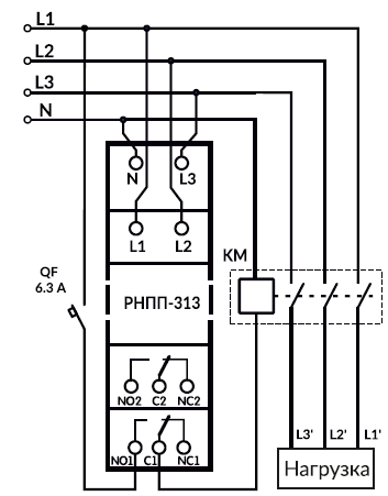 Реле напряжения, перекоса и последовательности фаз РНПП-313 предназначено для отключения нагрузки 400 В 50 Гц при: - Недопустимых колебаниях напряжения в сети с продолжительностью не менее 0,02 с; - Нарушении амплитудной симметрии сетевого напряжения (перекосе фаз); - Обрыве, нарушении последовательности и слипании фаз - Обрыве нуля РАБОТА ИЗДЕЛИЯ РНПП-313 постоянно контролирует значения напряжений в трехфазной сети, сопоставляя их с заводскими уставками. Изделие отключит нагрузку, если значение напряжения выйдет за пределы. РНПП-313 имеет одну регулируемую уставку времени задержки срабатывания защиты по перекосу фаз