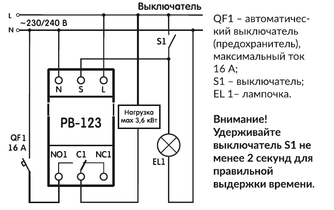 Реле времени РВ-123 предназначено для отключения нагрузки (вентилятора) после размыкания контактов выключателя в течение установленного пользователем времени. Например, в вентиляционных системах, санузлах и т.д. Выключателем включаем освещение. Вентилятор включится. После отключения освещения нагрузка (вентилятор) отключится через установленный промежуток времени. Выдержка времени от 1 до 15 мин.