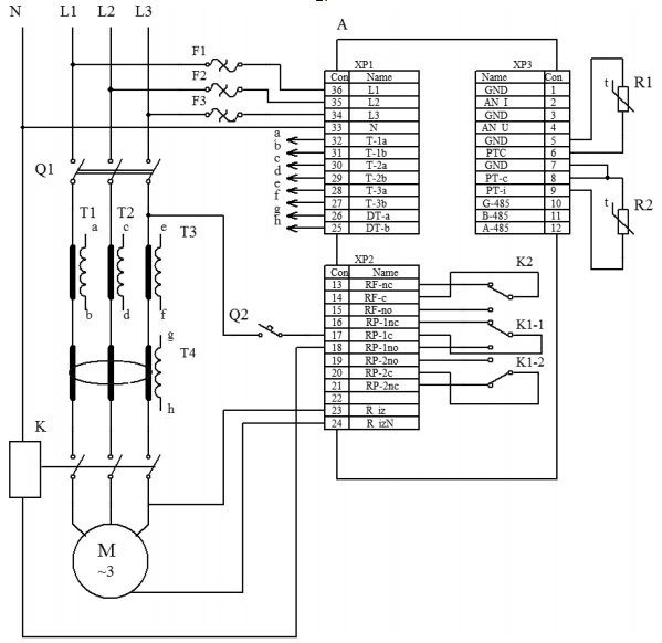 УБЗ-304 предназначен для защиты асинхронных электродвигателей мощностью от 2,5 до 315 кВт при использовании внешних стандартных токовых трансформаторов с выходным током 5 А. УБЗ-304 может работать в сетях как с изолированной, так и глухозаземленной нейтралью. Исполнение прибора – щитовое. УБЗ обеспечивает постоянный контроль параметров сетевого напряжения, действующих значений фазных (линейных) токов трехфазного электрооборудования 380 В 50 Гц и проверку значения сопротивления изоляции электродвигателей. УБЗ-304 обеспечивает защиту электродвигателей при: - некачественном сетевом напряжении (недопустимые скачки напряжения, обрыв фаз, нарушение чередования и слипание фаз, перекос фазных/линейных напряжений, снижение частоты сети ниже заданной и (или) повышение частоты сети выше заданной); - механических перегрузках (симметричный перегруз по фазным/линейным токам); - превышении порога током обратной последовательности; - несимметрии фазных токов без перегруза, связанной с нарушением изоляции внутри двигателя и/или подводящего кабеля (сравнение коэффициента несимметрии тока по обратной последовательности с коэффициентом несимметрии напряжения по обратной последовательности); - исчезновении момента на валу электродвигателя («сухой ход» - для насосов) – защита по минимальному пусковому и/или рабочему току; - затянутом пуске двигателя или блокировке ротора; - недопустимо низком уровне изоляции между статором и корпусом двигателя (проверка перед включением); - замыкании на «землю» обмотки статора во время работы – защита по токам утечки на «землю»; - тепловой перегрузке двигателя; - перегреве обмоток (определяется температура обмоток при использовании встроенных в двигатель температурных датчиков или температура корпуса при использовании внешних температурных датчиков).