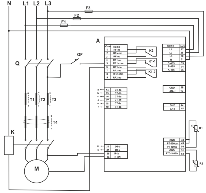 УБЗ предназначен для защиты асинхронных электродвигателей мощностью от 2,5 до 315 кВт при использовании внешних стандартных токовых трансформаторов с выходным током 5 А. УБЗ может работать в сетях как с изолированной, так и глухозаземленной нейтралью. Исполнение прибора – DIN-рейка. УБЗ обеспечивает постоянный контроль параметров сетевого напряжения, действующих значений фазных (линейных) токов трехфазного электрооборудования 380 В 50 Гц и проверку значения сопротивления изоляции электродвигателей. УБЗ обеспечивает защиту электродвигателей при: - некачественном сетевом напряжении (недопустимые скачки напряжения, обрыв фаз, нарушение чередования и слипание фаз, перекос фазных/линейных напряжений, снижение частоты сети ниже заданной и (или) повышение частоты сети выше заданной); - механических перегрузках (симметричный перегруз по фазным/линейным токам); - превышении порога током обратной последовательности; - несимметрии фазных токов без перегруза, связанной с нарушением изоляции внутри двигателя и/или подводящего кабеля (сравнение коэффициента несимметрии тока по обратной последовательности с коэффициентом несимметрии напряжения по обратной последовательности); - исчезновении момента на валу электродвигателя («сухой ход» - для насосов) – защита по минимальному пусковому и/или рабочему току; - затянутом пуске двигателя или блокировке ротора; - недопустимо низком уровне изоляции между статором и корпусом двигателя (проверка перед включением); - замыкании на «землю» обмотки статора во время работы – защита по токам утечки на «землю»; - тепловой перегрузке двигателя; - перегреве обмоток (определяется температура обмоток при использовании встроенных в двигатель температурных датчиков или температура корпуса при использовании внешних температурных датчиков).