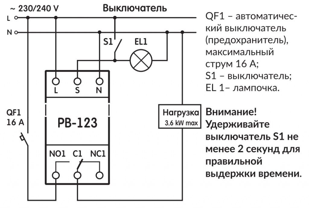 Реле времени РВ-123 предназначено для отключения нагрузки (вентилятора) после размыкания контактов выключателя в течение установленного пользователем времени. Например, в вентиляционных системах, санузлах и т.д. Выключателем включаем освещение. Вентилятор включится. После отключения освещения нагрузка (вентилятор) отключится через установленный промежуток времени.
