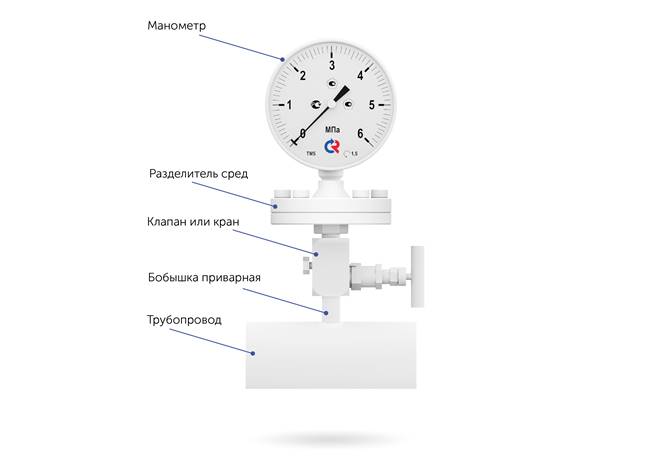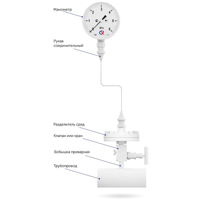 Для защиты чувствительного элемента манометра или датчика давления от контакта с агрессивной, вязкой или абразивной измеряемой средой рекомендуется устанавливать прибор в сборе с мембранным разделителем сред, заполненным разделительной жидкостью.