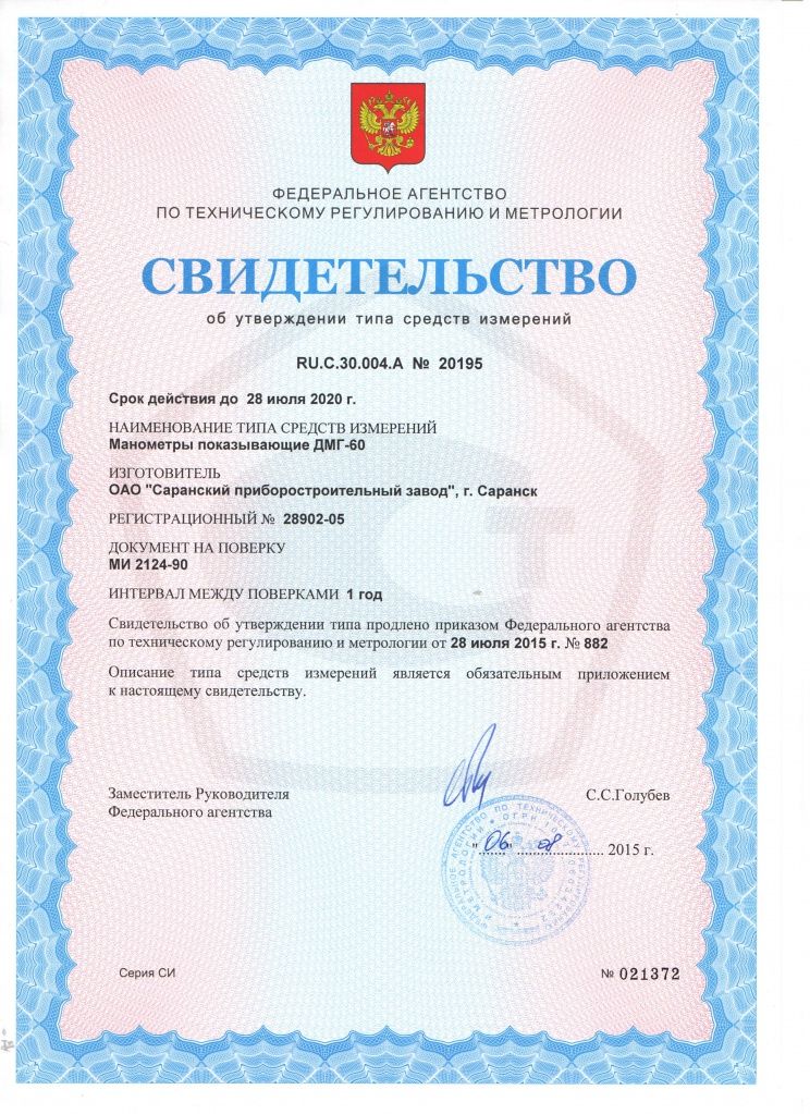 «Манометр показывающий ДМГ-60-6 кПа-1,5-У3 ТУ 4212-118-00227471-2005»;