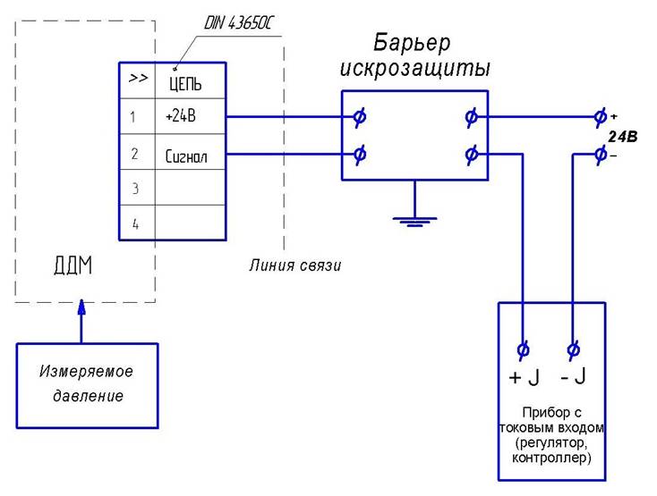 Схема подключения датчика ДДМ-03-Ех на объекте с применением барьера искрозащиты