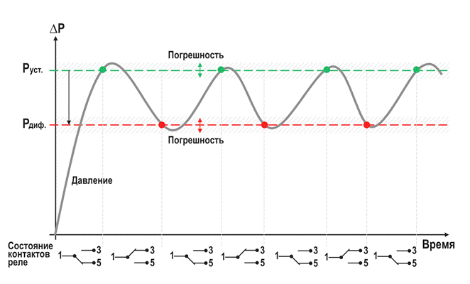 Принцип действия реле состоит в сравнении двух давлений, подаваемых с двух сторон на сильфон, который, деформируясь, переключает однополюсный перекидной контакт. Порог срабатывания реле настраивается пользователем.