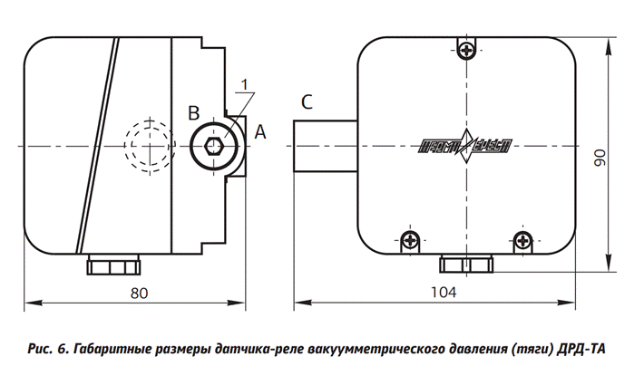 Датчики-реле вакуумметрического давления ДРД-ТA (рис. 2) подключаются к системе с помощью резьбового отверстия С. При этом необходимо, чтобы одно из отверстий (А или В) обязательно было открыто (соединялось с атмосферой).