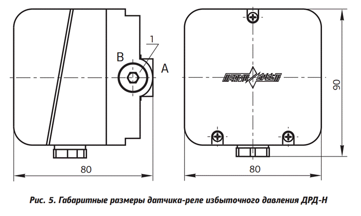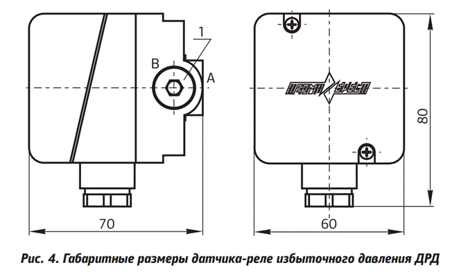 Датчики-реле избыточного давления ДРД-Н (рис. 1) подключаются к системе с помощью резьбовых (G¼) отверстий А и В. При этом, если давление подается через отверстие А, отверстие В закрывается заглушкой 1 и наоборот.