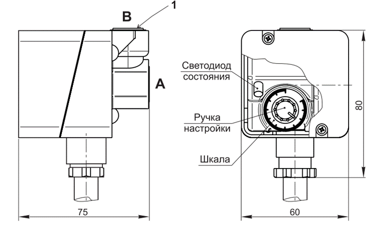 6. Датчики-реле давления электронного типа подключаются к газовой системе с помощью резьбовых (G1/4) отверстий А и В. При этом, если давление подаётся через отверстие А, отверстие В закрывается заглушкой 1 и наоборот.