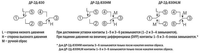 В состав прибора входят два реле – высокого и низкого давления, каждое подключается к соответствующей магистрали. При поднятии давления до значения уставки, происходит переключение контактов реле. При падении давления в магистралях, контакты возвращаются в исходное положение. Для переключения контактов может потребоваться ручной сброс состояния реле в моделях с кнопкой ручного сброса.